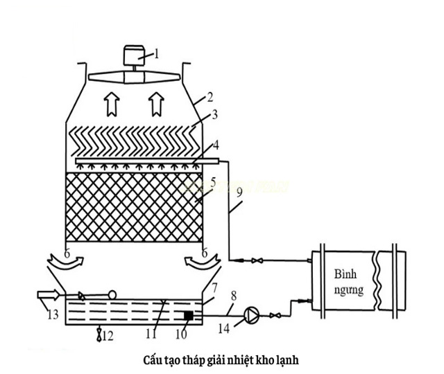 Tháp giải nhiệt kho lạnh hoạt động tối ưu là sự kết hợp hoàn hảo của nhiều bộ phận được thiết kế tỉ mỉ, bao gồm: